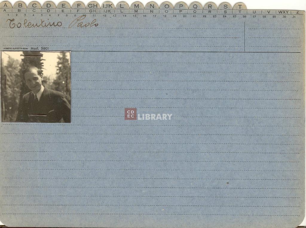 Paolo Tolentino, figlio di Giuseppe Tolentino e Anna Polacco è nato in Austria a Graz il 19 febbraio 1917. Arrestato a Roma (Roma). Deportato nel campo di sterminio di Auschwitz. Non è sopravvissuto alla Shoah. luogo di arresto: Roma data di arresto: 03/02/1944 luogo di detenzione: ROMA carcere luogo di raccolta: FOSSOLI campo destino: Morto/a in campo di sterminio numero di convoglio: convoglio n. 13, 26/06/1944 data di partenza del convoglio: 26/06/1944 data di arrivo del convoglio: 30/06/1944 campo di destinazione: Auschwitz numero di matricola: - |