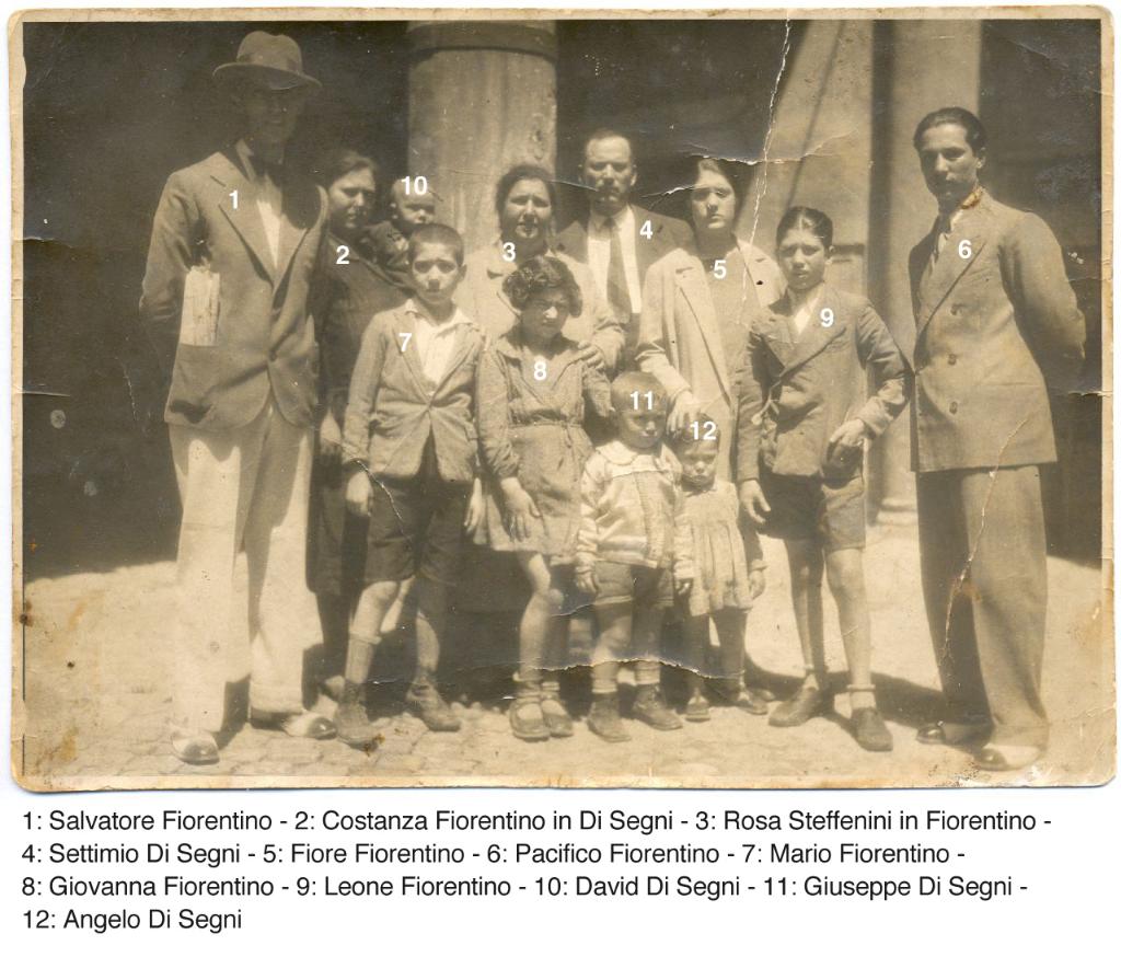 | osservazioni | Nella fotografia sono ritratti 1: Salvatore Fiorentino, 2: Costanza (detta Cilla) in Di Segni, 3: Rosa Steffenini in Fiorentino, 4: Settimio Di Segni, 5: Fiore Fiorentino, 6: Pacifico Fiorentino, 7: Mario Fiorentino, 8: Giovanna (poi coniugata Vivanti), 9: Leone Fiorentino, 10: David Di Segni, 11: Giuseppe Di Segni, 12: Angelo Di Segni |