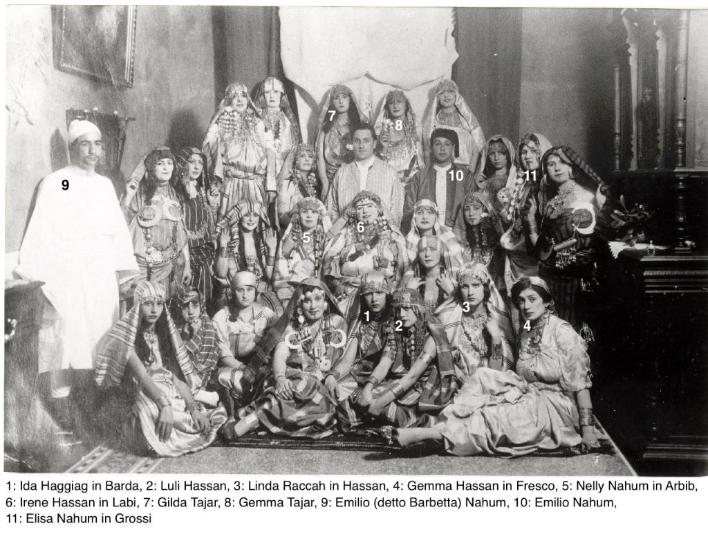 | osservazioni | Nella fotografia si riconoscono: 1: Ida Haggiag in Barda, 2: Luli Hassan, 3: Linda Raccah in Hassan, 4: Gemma Hassan in Fresco, 5: Nelly Nahum in Arbib: 6: Irene Hassan in Labi, 7: Gilda Tajar, 8: Gemma Tajar, 9: Emilio (detto Barbetta) Nahum, 10: Emilio Nahum, 11: Elisa Nahum in Grossi |
