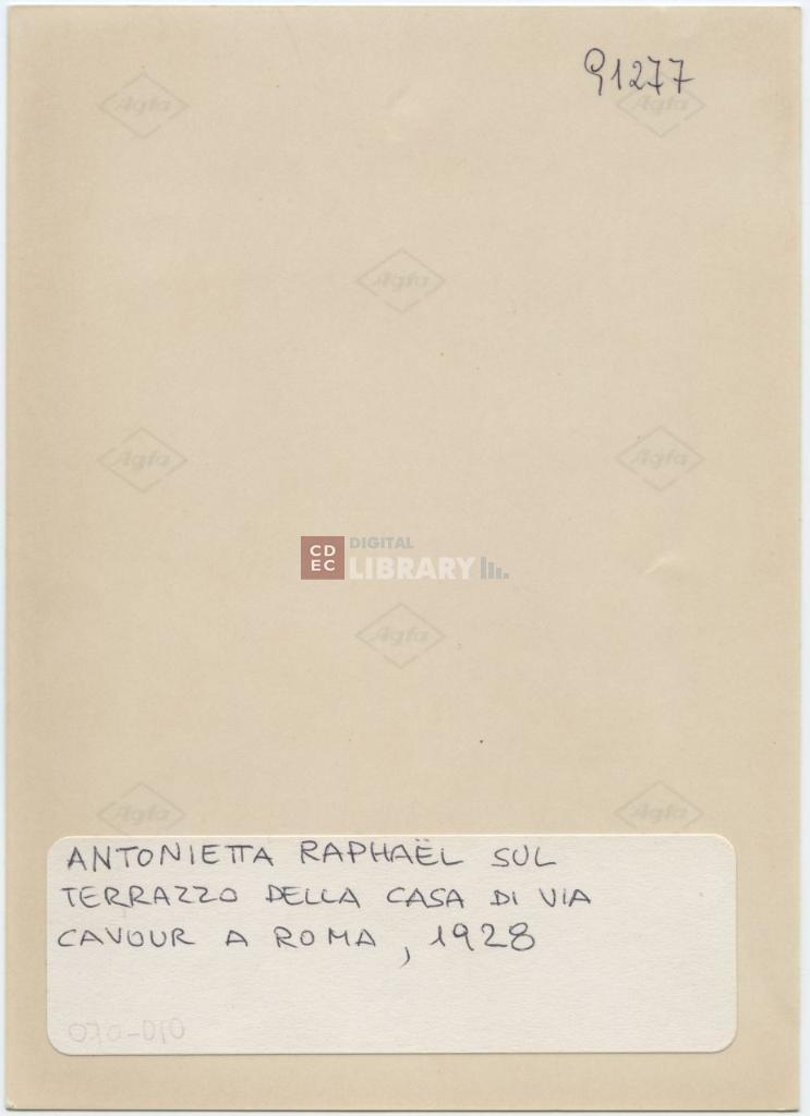 iscrizioni | sul verso del supporto in alto a destra il numero "91277" e sull'etichetta la didascalia manoscritta "Antonietta Raphaël sul terrazzo della casa di via Cavour a Roma, 1928" |