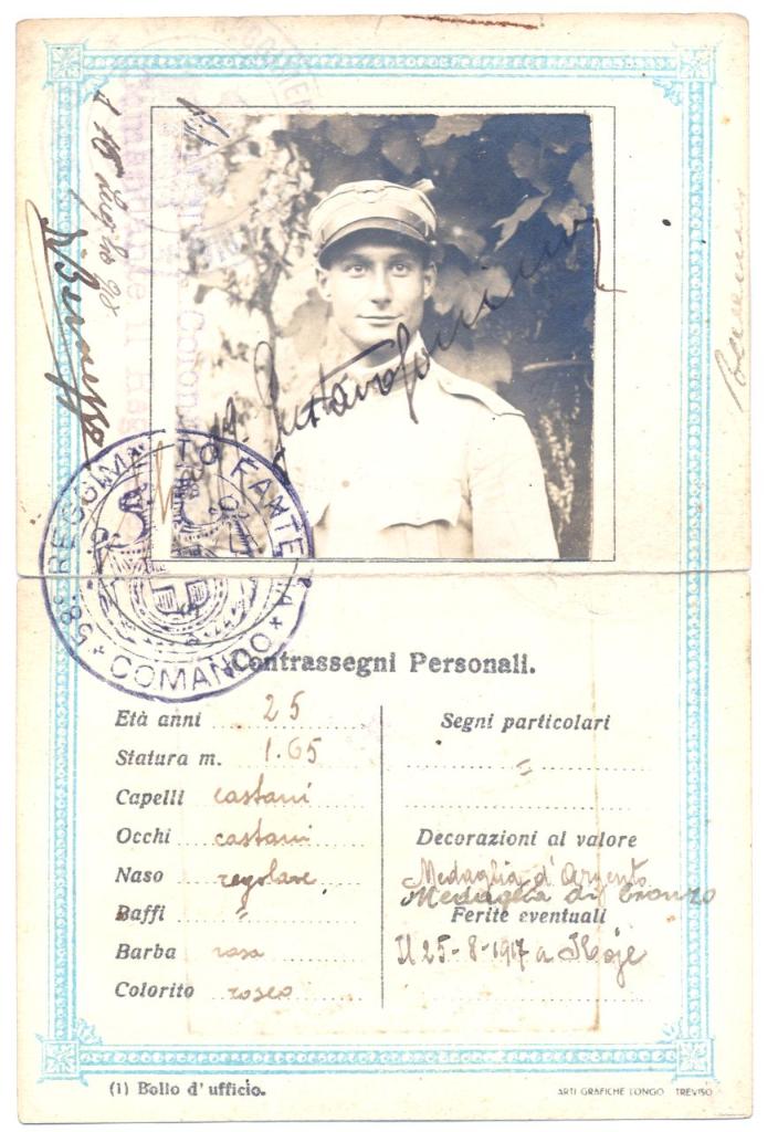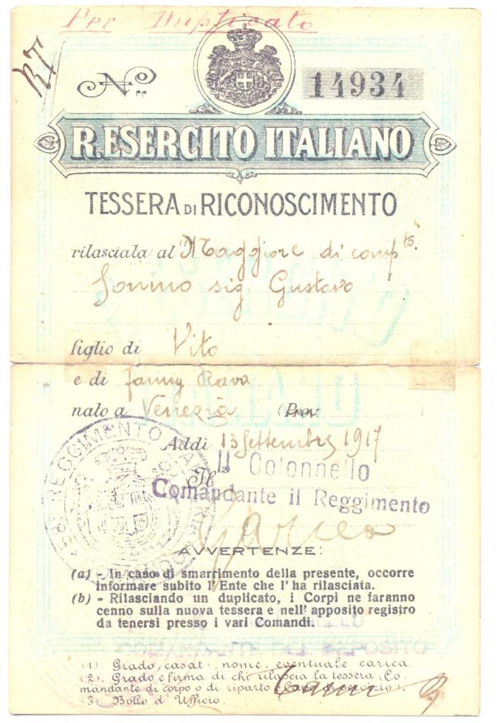 | osservazioni | Gustavo Sonino (nonno materno del donatore Stefano Jesurum), maggiore di complemento in Fanteria, fu il più giovane sottoufficiale della Prima guerra mondiale. Ferito il 25 agosto 1917, ottiene una medaglia d'argento e una di bronzo per meriti di guerra. La tessera di riconoscimento dell'esercito italiano fu emessa dal Comando del 58° Reggimento di fanteria |