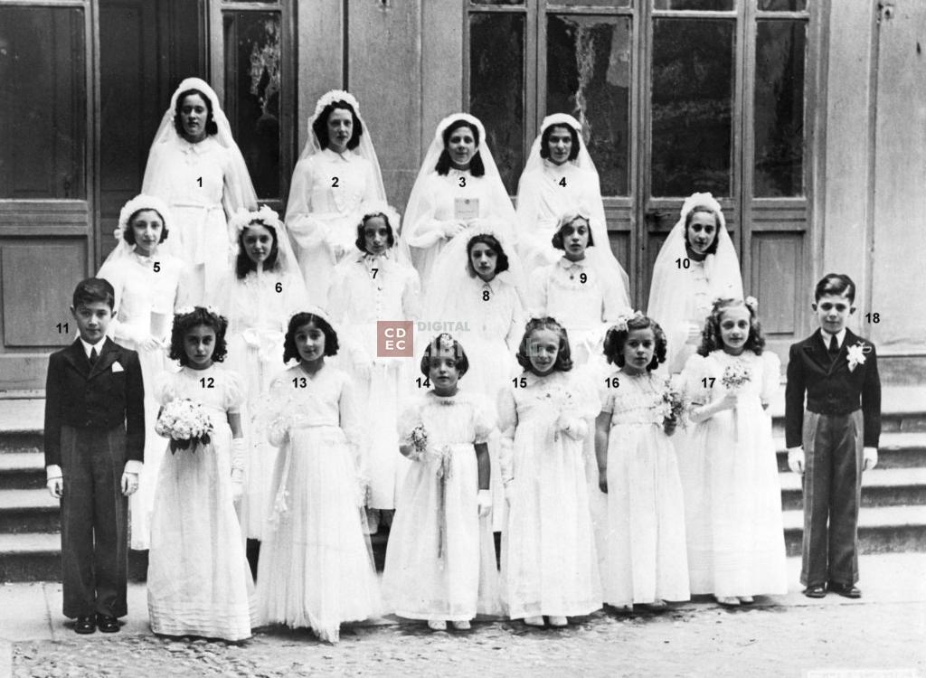 | osservazioni | Nella fotografia si riconoscono 1: Carla Bachi, 2: Elena Ottolenghi (poi coniugata Vita Finzi), 3: Adalgisa Della Rocca (poi coniugata Piperno), 4: Marisa Falco (poi coniugata D'Asdia), 5: Adriana Segre, 6: Nedelia Lolli (poi in Tedeschi), 7: Franca De Benedetti (poi coniugata Loewenthal), 8-9: due ragazze non identificate, 10: Elena Passigli, 11: Camillo De Benedetti, 12: Miriam Disegni, 13: Mirella Levi (poi coniugata Fiz), 14: Ornella De Benedetti (poi coniugata Levi), 15: [?] Deangeli, 16: bambina non identificata, 17: Vanda Deangeli, 18: Ruggero Jona (arrestato e deportato ad Auschwitz). Lo scatto - che ritrae banot mitzvot insieme alle paggette e ai paggetti - è stato eseguito nel cortile della scuola ebraica Colonna e Finzi, situata in via Sant'Anselmo 7 a Torino |