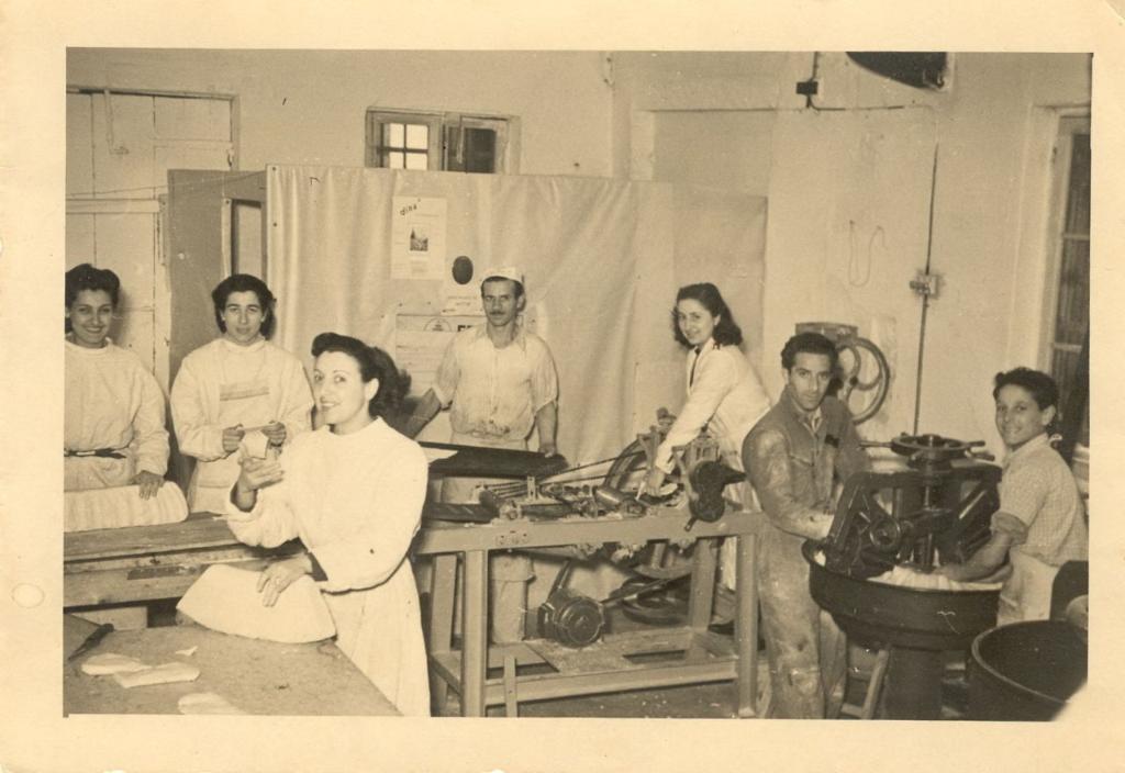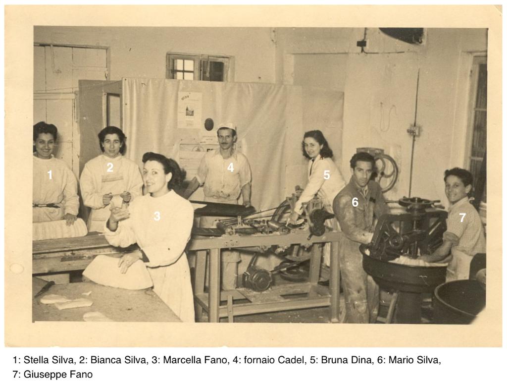 | notizie storico-critiche | Lo scatto riprende Stella Silva, Bianca Silva, Marcella Fano, Bruna Dina, Mario Silva Giuseppe Fano e il fornaio Cadel al lavoro nel Forno delle Azzime in Calle del Forno a Venezia nel 1951 |