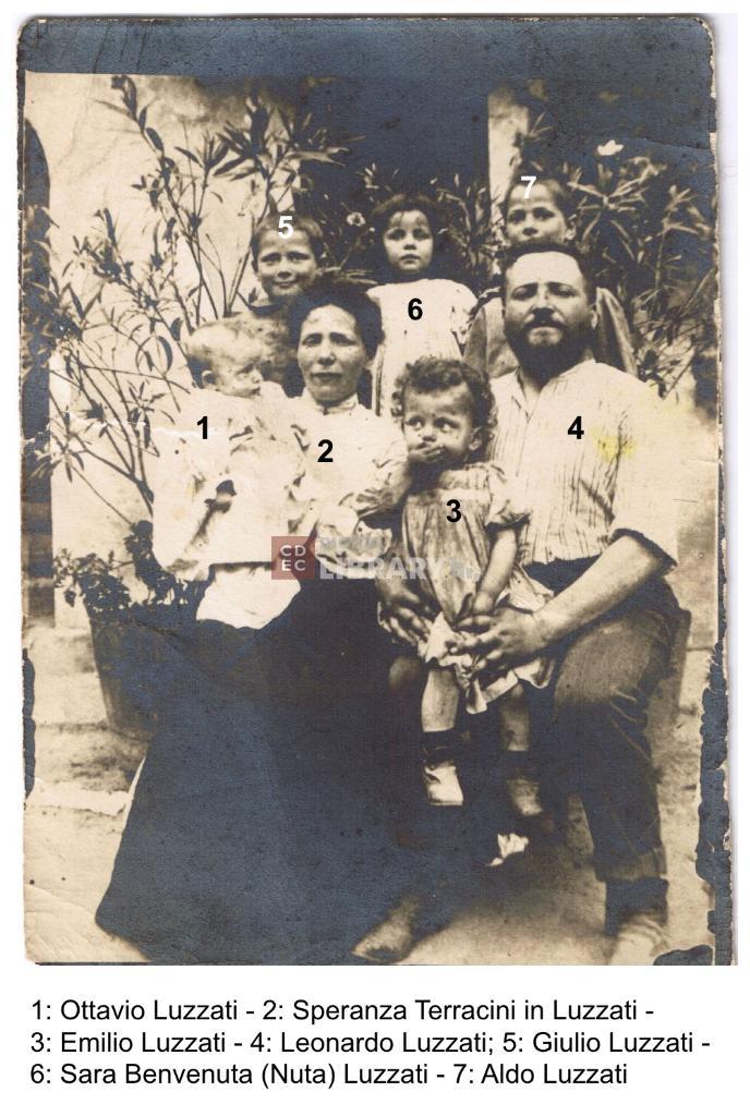 | osservazioni | Nella fotografia si riconoscono 1: Ottavio Luzzati in braccio 2: alla madre Speranza Terracini in Luzzati e 3: Emilio Luzzati in braccio 4: al padre Leonardo Luzzati; dietro di loro da sinistra i tre fratelli 5: Giulio Luzzati, 6: Sara Benvenuta (detta Nuta) Luzzati e 7: Aldo Luzzati |