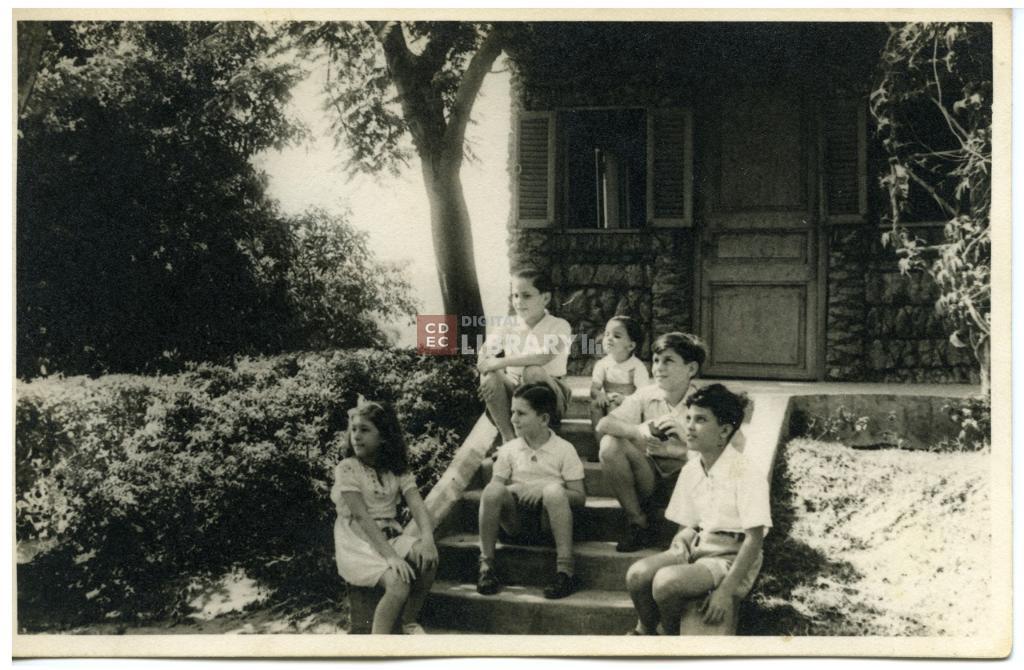 titolo attribuito | Roger Sciama con i cugini Colette e Andrée Sciama, Alberto e Victor Sciama (sopra), e il fratello Davide Harari al Gezira Garden del Cairo |