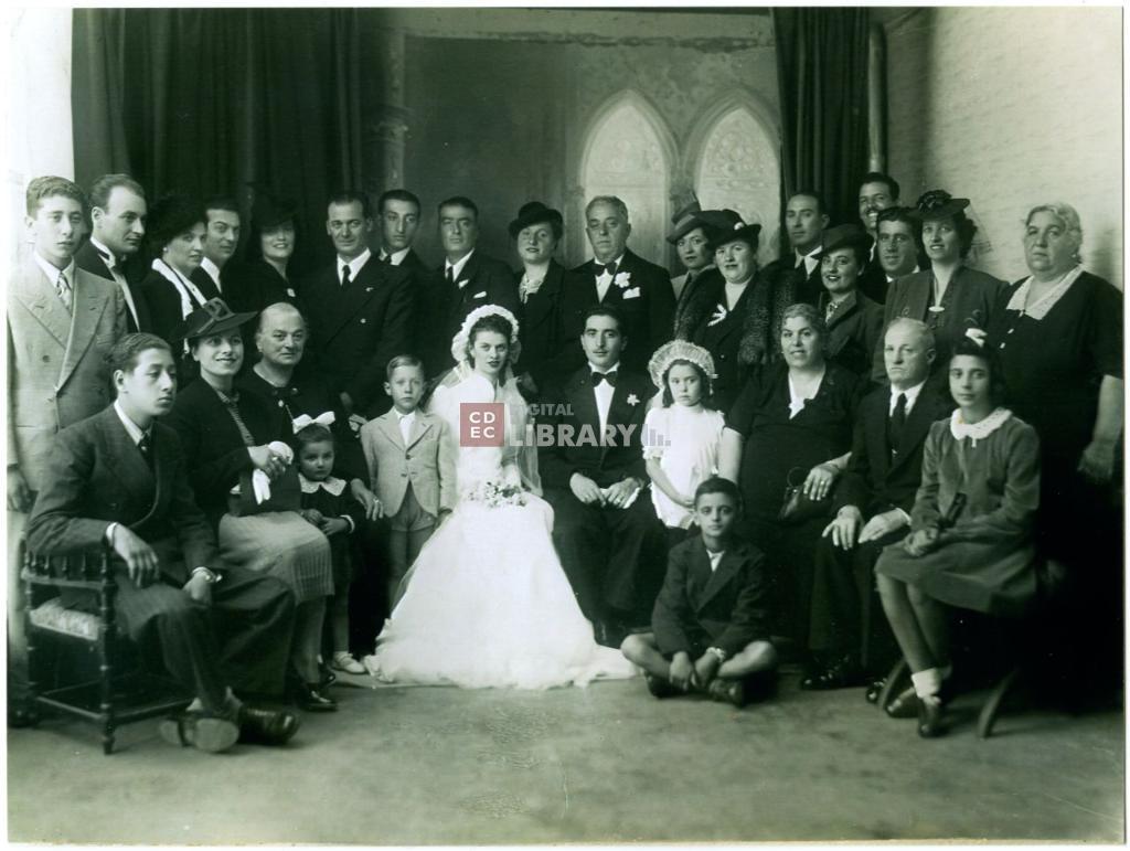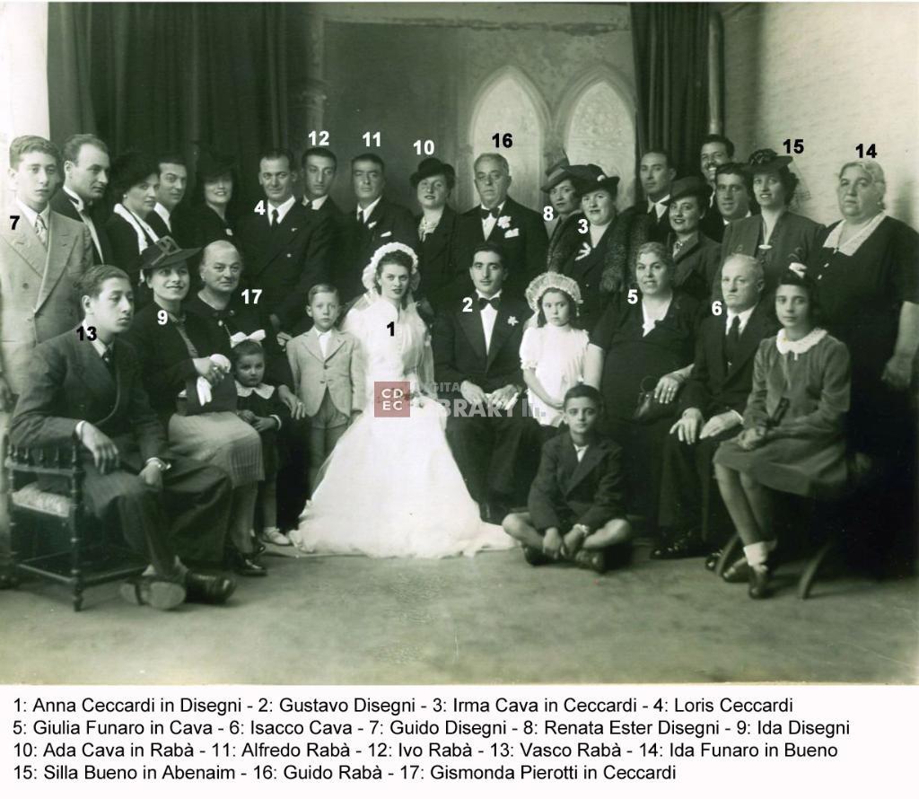 osservazioni | Nella fotografia si riconoscono 1: la sposa Anna Ceccardi in Disegni, 2: lo sposo Gustavo Disegni, 3: Irma Cava in Ceccardi (madre della sposa), 4: Loris Ceccardi (padre della sposa, cattolico), 5: Giulia Funaro in Cava (nonna materna della sposa), 6: Isacco Cava (nonno materno della sposa), 7: Guido Disegni (fratello dello sposo), 8: Renata Ester Disegni (sorella dello sposo), 9: Ida Disegni (sorella dello sposo), 10: Ada Cava in Rabà (zia materna della sposa), 11: Alfredo Rabà (zio materno della sposa), 12: Ivo Rabà (cugino della sposa), 13: Vasco Rabà (cugino della sposa), 14: Ida Funaro in Bueno (sorella della nonna materna della sposa), 15: Silla Bueno in Abenaim (cugina della mamma della sposa), 16: Guido Rabà (zio materno dello sposo), 17: Gismonda Pierotti in Ceccardi (nonna paterna della sposa, cattolica) |