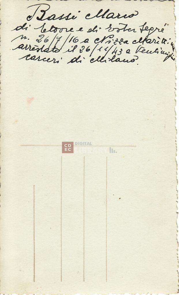 iscrizioni | sul verso del supporto: "Bassi Marco di Ettore e di Ester Segré n. 26/7/16 a Nizza Marittima arrestato il 26/11/43 a Ventimiglia carceri di Milano." |