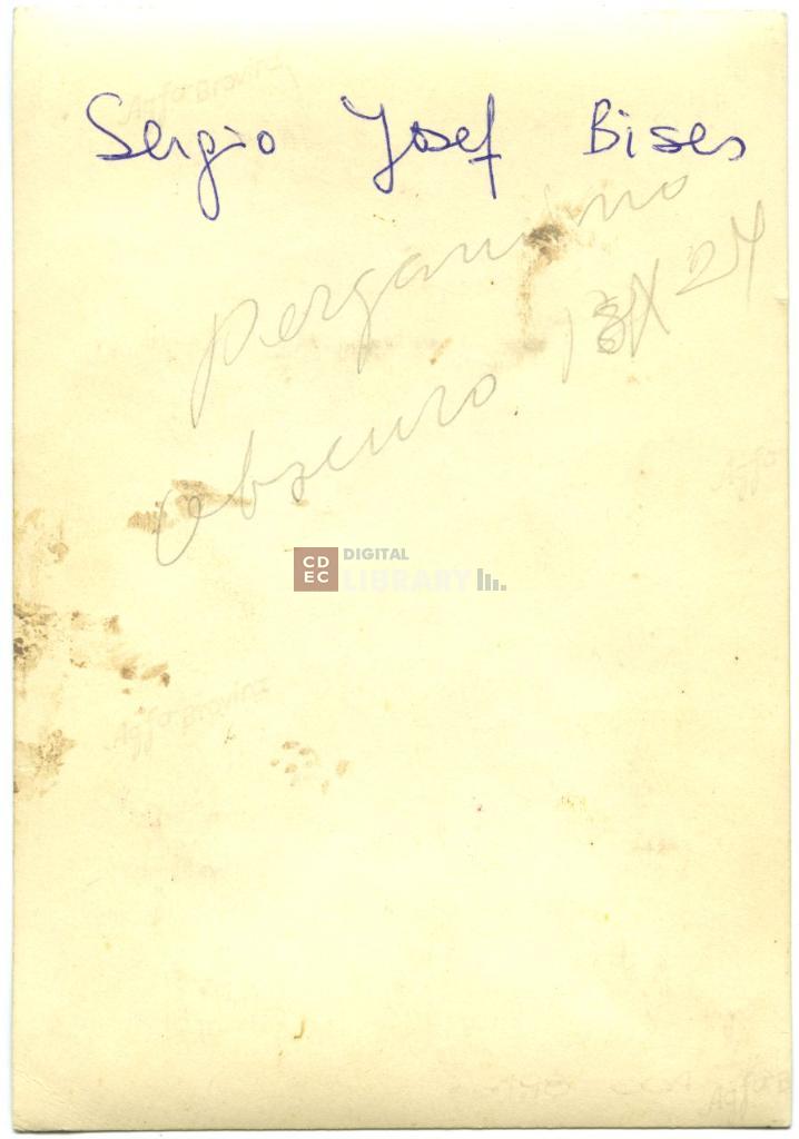| iscrizioni | sul verso del supporto la didascalia manoscritta: "Sergio Josef Bises" e l'indicazione tipografica "pergamino obscuro 18x27" - sul foglio allegato: "Sergio Josef Bises foto di circa 3 mesi prima della morte scattata dal prof. Giovanni Turin (filosofia) esule a B. Aires come antifascista e marito di Elda Calderoni, ebrea" |