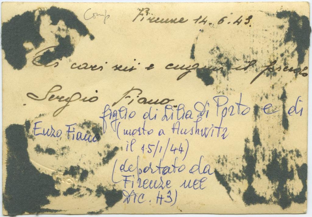 | iscrizioni | sul verso del supporto la dedica "Firenze 14-6-43. Ai cari zii e cugini il picolo Sergio Fiano" e l'iscrizione "figlio di Lilia Di Porto e di Enzo Fiano (morto a Auschwitz il 15/1/44) (deportato da Firenze nel dic. 43)" |