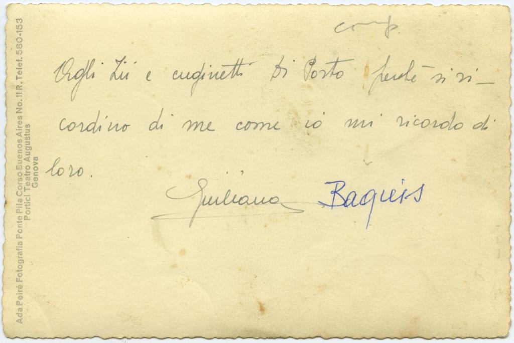 | iscrizioni | nell'immagine in basso la scritta: "Genova, Febbraio 1940/ Giuliana" - sul verso del supporto la dedica: "Agli zii e cuginetti Di Porto perché si ricordino di me come io mi ricordo di loro. Giuliana Baquis" e iscrizione commerciale del fotografo |