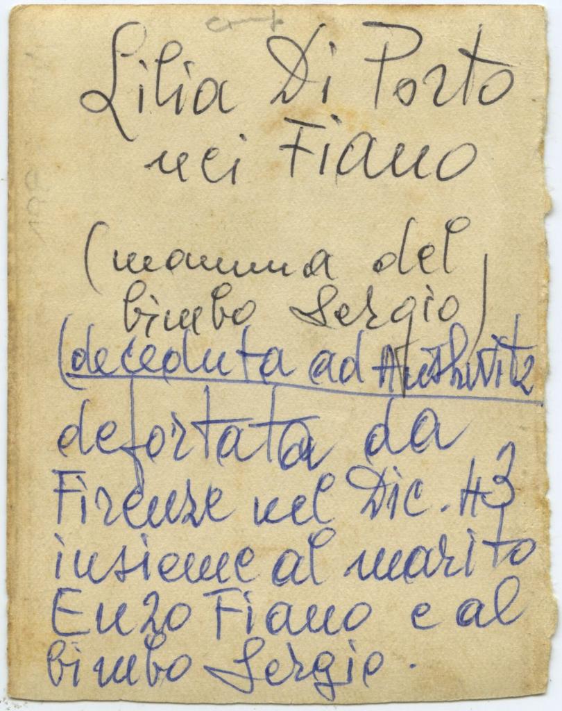| iscrizioni | sul verso del supporto l'indicazione manoscritta: "Lilia Di Porto nei Fiano (mamma del bimbo Sergio)/ deceduta ad Auschwitz deportata da Firenze nel Dic. 43 insieme al marito Enzo Fiano e al bimbo Sergio" |