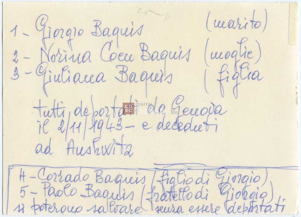 | iscrizioni | sul verso del supporto l'indicazione manoscritta: "1 - Giorgio Baquis (marito)/ 2 - Norina Coen Baquis (moglie)/ 3 - Giuliana Baquis (figlia/ tutti deportati da Genova il 2/11/1943 e deceduti ad Auschwitz" e "4 - Corrado Baquis (figlio di Giorgio)/ 5 - Paolo Baquis (fratello di Giorgio) si poterono salvare senza essere deportati" - nell'immagine in basso i numeri 4 5 1 2 3! |