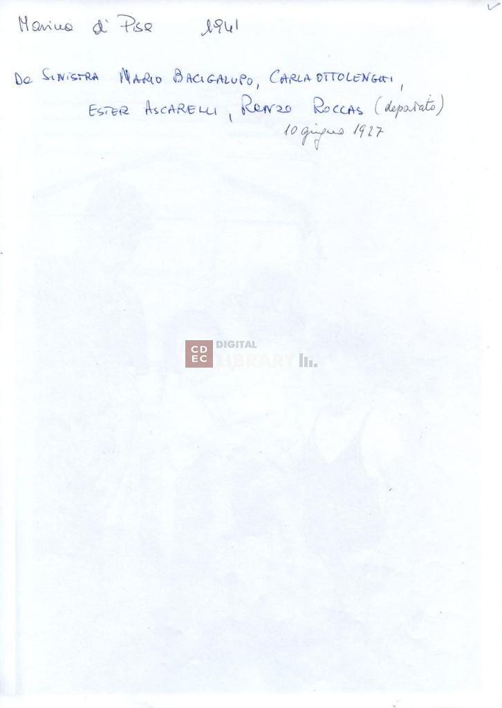 | iscrizioni | sulla fotocopia la nota manoscritta "Marina di Pisa 1941/ Da sinistra Mario Bacigalupo, Carla Ottolenghi, Ester Ascarelli, Renzo Roccas" |