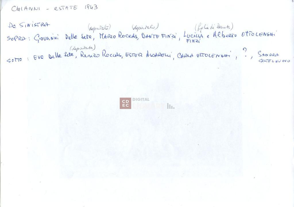 iscrizioni | sulla fotocopia la nota manoscritta "Chianni - estate 1943" seguita dall'elenco dei nomi delle persone ritratte |