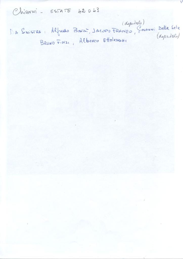 | iscrizioni | sulla fotocopia la nota manoscritta "Chianni - estate 42 o 43/ Da sinistra: Alfredo Bondì, Jacopo Franco, Giovanni Della Seta, Bruno Finzi, Alberto Ottolenghi" |