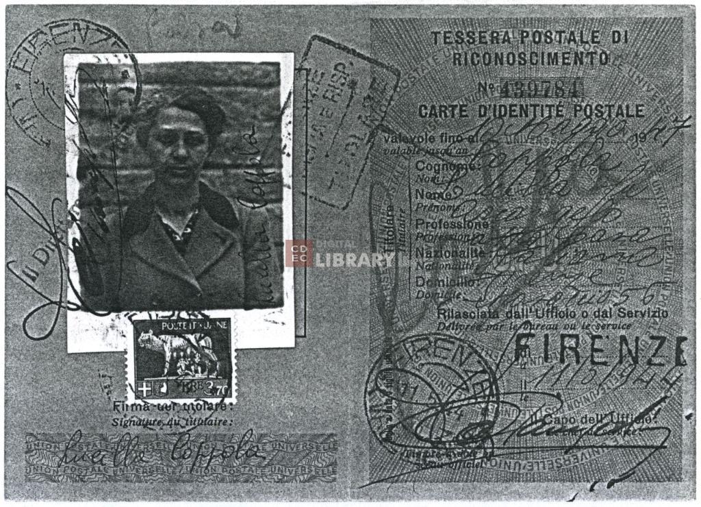 | notizie storico-critiche | Il documento d'identità di Lucilla Finzi in Ottolenghi (vedova di Sergio Ascarelli), venne intestato al falso nome di Lucilla Coppola e rilasciato a Firenze. Presentato alla polizia svizzera, i funzionari soprascrissero la dicitura "falsa" |