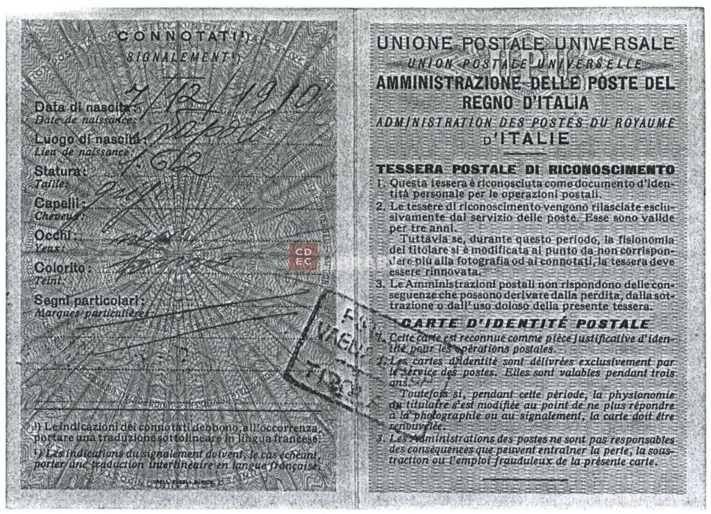 | titolo attribuito | Tessera postale di riconoscimento con false generalità di Lucilla Finzi in Ottolenghi (alias Lucilla Coppola) |