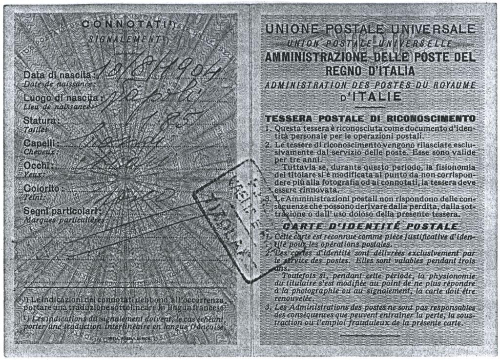 | titolo attribuito | Tessera postale di riconoscimento con false generalità di Alberto Ottolenghi (alias Alberto Carlo Coppola) |