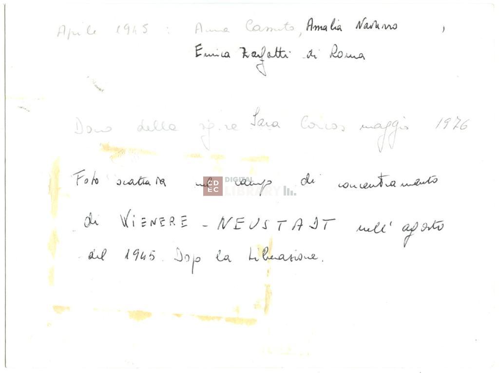 | iscrizioni | sul verso del supporto l'indicazione manoscritta: "Aprile 1945: Anna Cassuto, Amalia Navarro, Enrica Zarfatti [sic] di Roma/ Dono della sig.ra Sara Corcos maggio 1976/ Foto scattata nel campo di concentramento di Wienere-Neustadt nell'agosto del 1945. Dopo la Liberazione." |