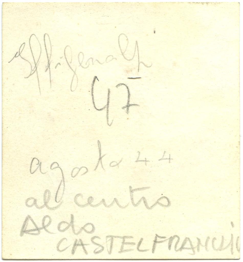 | iscrizioni | sul verso del supporto la didascalia manoscritta a matita "Iffigenalp agosto 1944/ al centro Aldo Castelfranchi" |