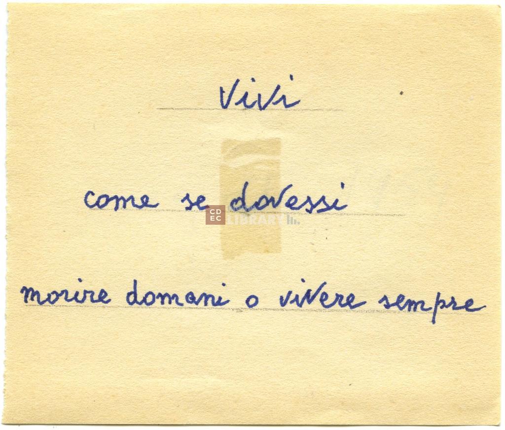 | iscrizioni | sul verso del supporto secondario l'iscrizione manoscritta "vivi come se dovessi morire domani o vivere sempre" |