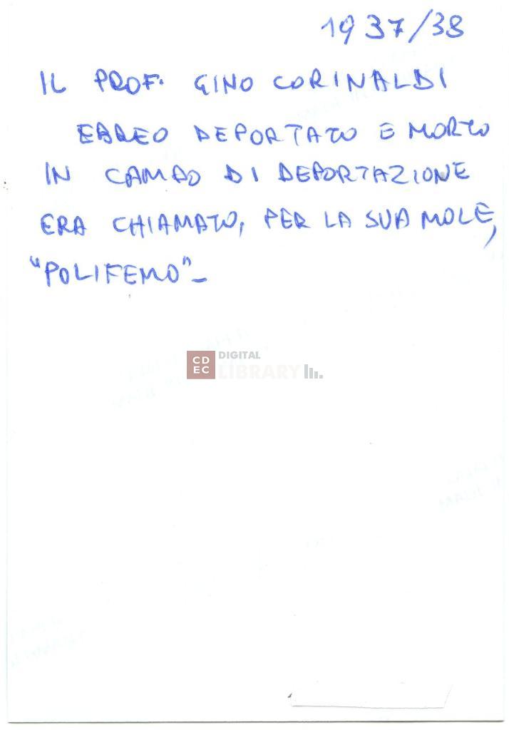| iscrizioni | sul verso del supporto: "1937/38 Il prof. Gino Corinaldi ebreo deportato e morto in campo di deportazione era chiamato, per la sua mole, "Polifemo". |