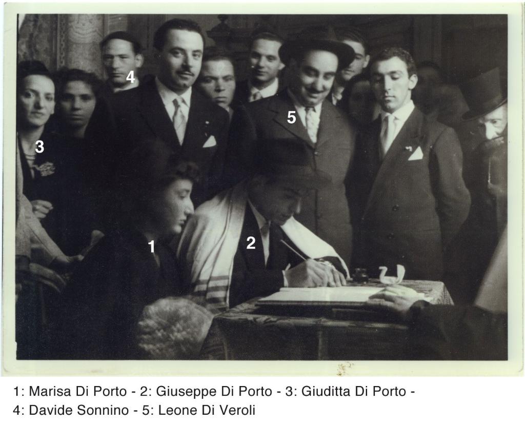 | osservazioni | Nella fotografia si riconoscono 1: la sposa Marisa Di Porto in Di Porto, 2: lo sposo Giuseppe Di Porto, 3: Giuditta Di Porto, 4: Davide Sonnino e 5: Leone (Leo) Di Veroli |
