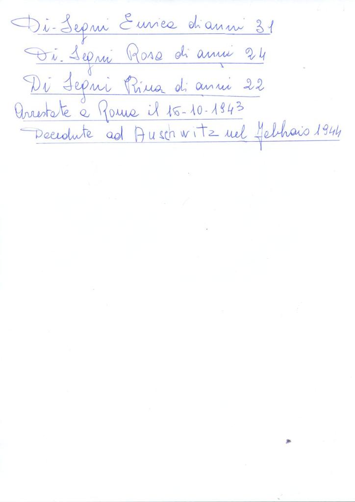 | iscrizioni | sul verso del supporto l'indicazione manoscritta: "Di Segni Enrica di anni 31/ Di Segni Rosa di anni 24/ Di Segni Rina di anni 22/ Arrestate a Roma il 16-10-1943/ Decedute ad Auschwitz nel Febbraio 1944" |