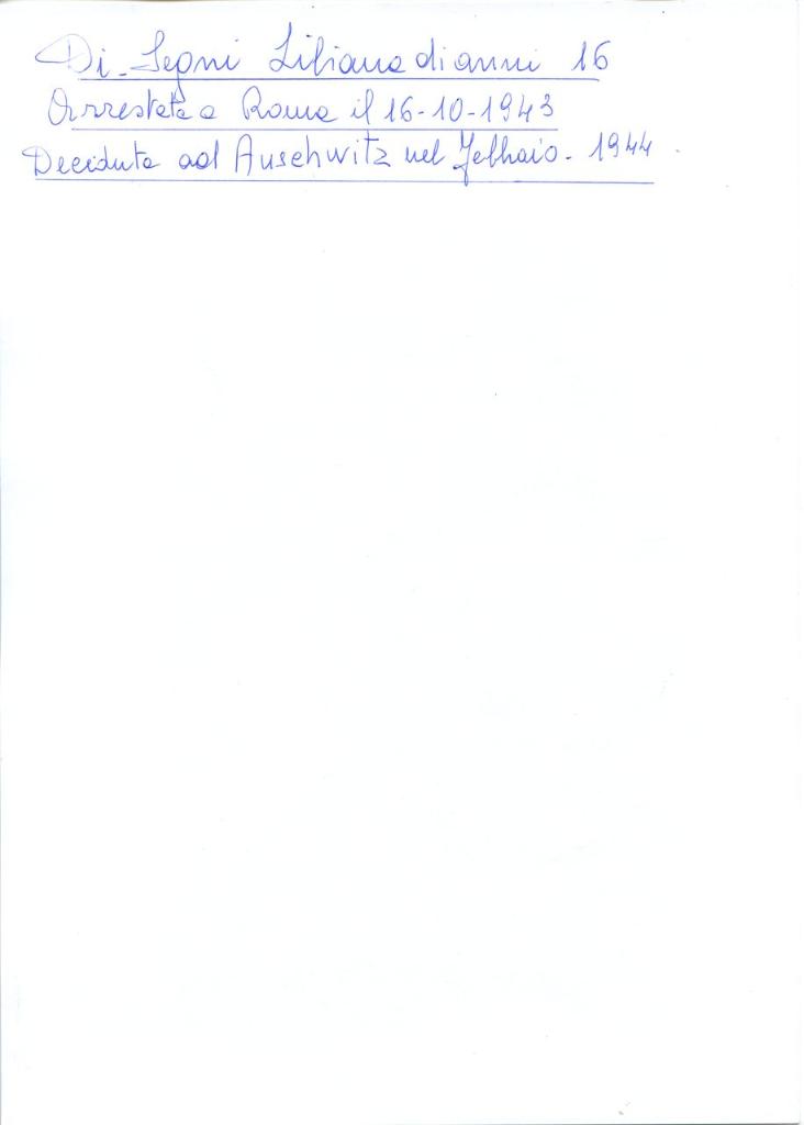 | iscrizioni | sul verso del supporto l'indicazione manoscritta: "Di Segni Liliana di anni 16/ Arrestata a Roma il 16-10-1943/ Deceduta ad Auschwitz nel Febbraio 1944" |