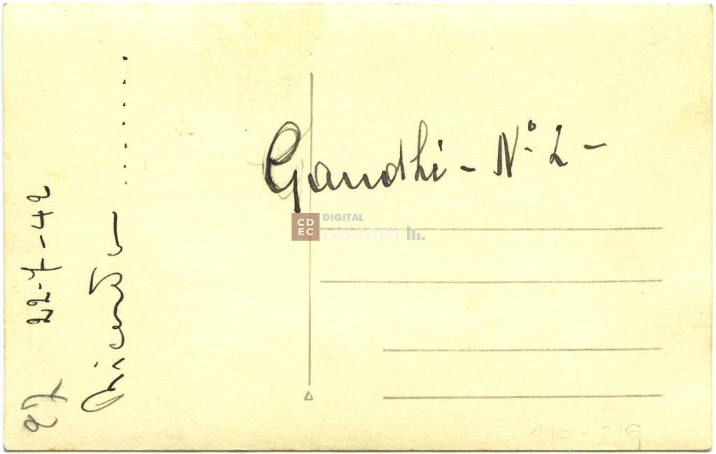 | iscrizioni | sul verso del supporto l'indicazione manoscritta "Gandhi n.2", "22-7-42/ Ricordo..." e un post-it con la scritta "Enzo Fortis" |