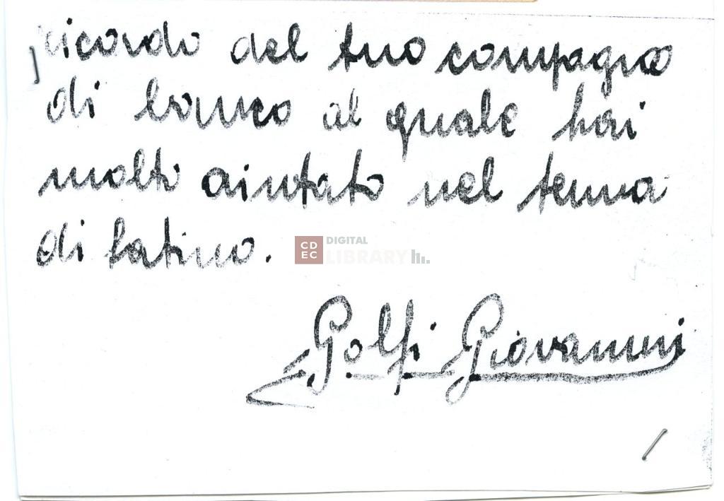 | iscrizioni | sul recto del supporto in basso la dedica: "ricordo del tuo compagno di lavoro al quale hai molto aiutato nel tema di latino. Golgi Giovanni" |