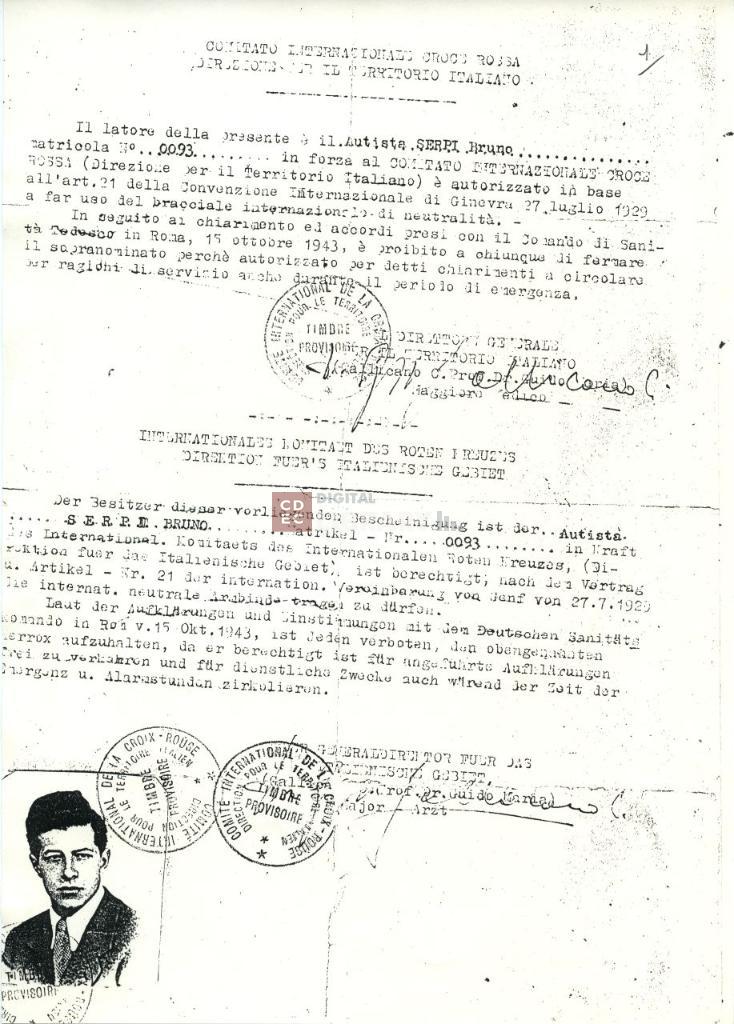 titolo attribuito | Attestato del Comitato Croce Rossa Internazionale di Bruno Serpi (alias Bruno Levi) |