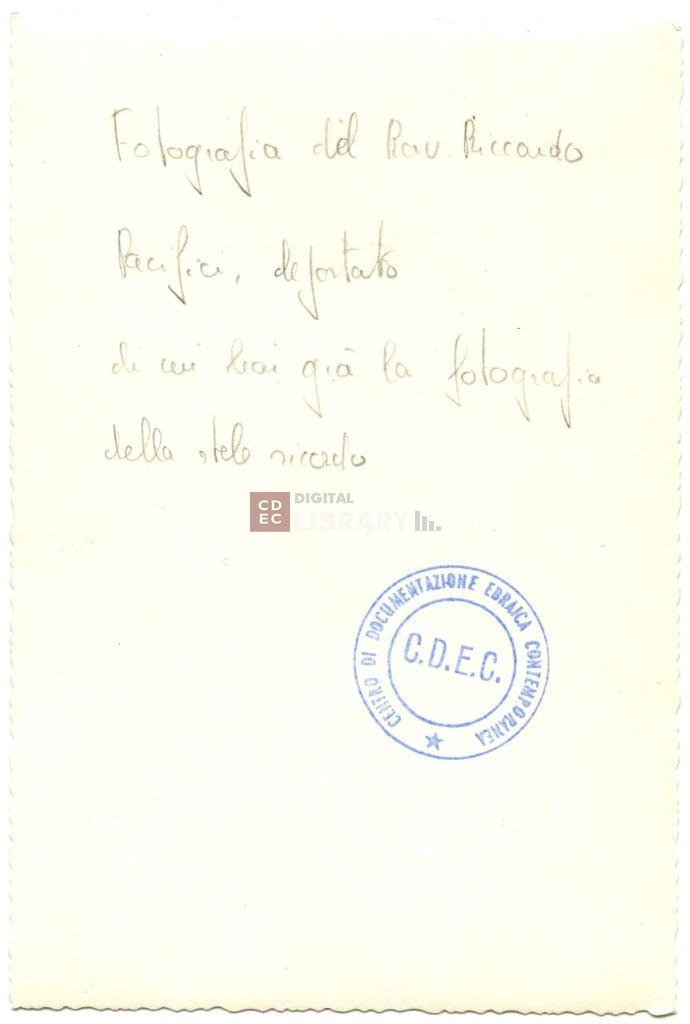 | iscrizioni | sul verso del supporto la nota manoscritta "Fotografia del Rav Riccardo Pacifici, deportato/ di cui hai già la fotografia della stele [...]" |
