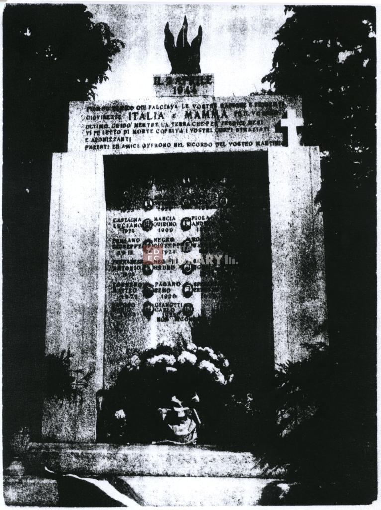 | iscrizioni | nell'immagine in alto l'epigrafe con la scritta "Il 2 aprile 1944/ piombo nemico qui falciava le vostre radiose e fiorenti giovinezze. Italia e mamma fu il vostro ultimo grido mentre la terra che per tredici mesi vi fu letto di morte copriva i vostri corpi straziati e agonizzanti/ Parenti ed amici offrono nel ricordo del vostro martirio" |