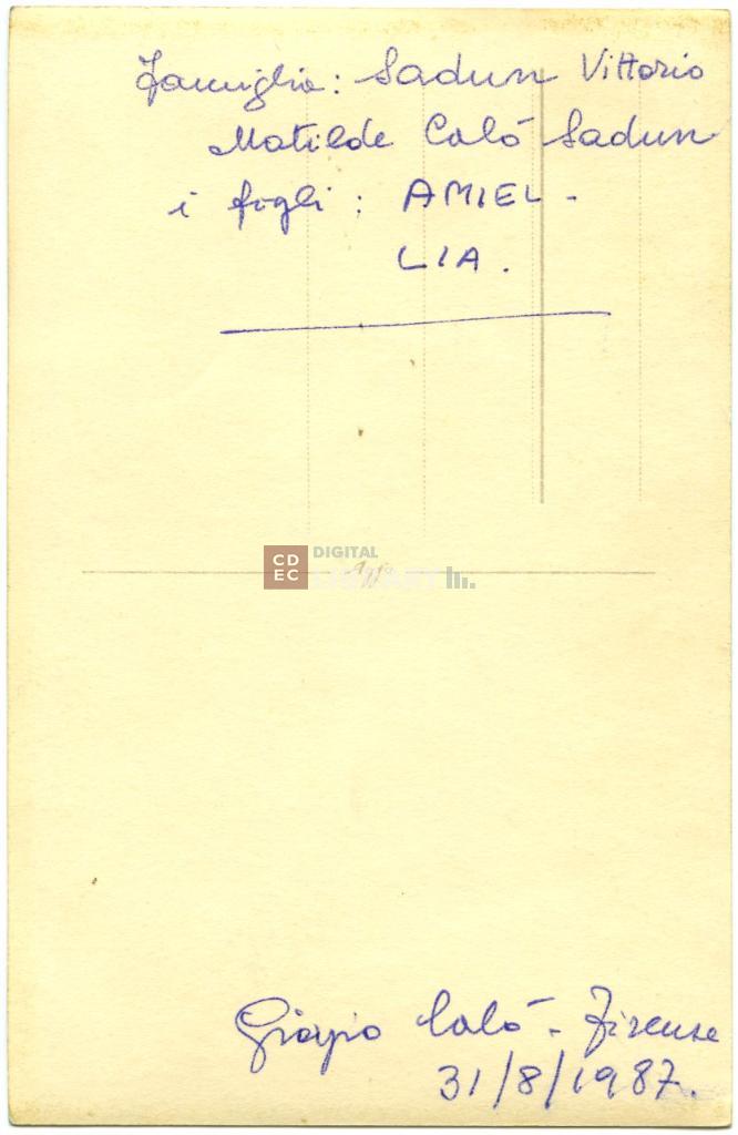 iscrizioni | nell'immagine in basso la didascalia inscritta fotograficamente "Viareggio 31 luglio 1943" - sul verso del supporto l'indicazione manoscritta "Famiglia: Sadun Vittorio/ Matilde Calò Sadun/ i figli: Amiel Lia" |