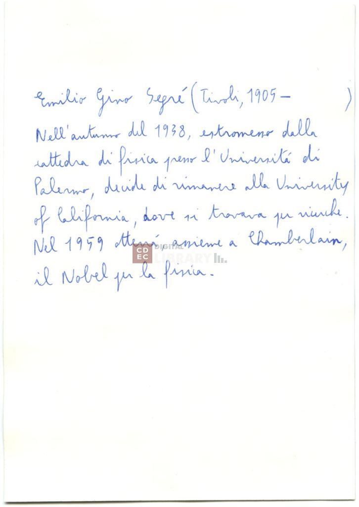 | notizie storico-critiche | Emilio Gino Segré, nato a Tivoli nel 1905, nell'autunno del 1938 viene estromesso dalla cattedra di fisica presso l'Università di Palermo e decide quindi di non fare ritorno in Italia ma rimanere alla University of California di Berkeley, dove si trovava per ricerche. Nel 1959 otterrà, assieme a Chamberlain, il Nobel per la fisica. |