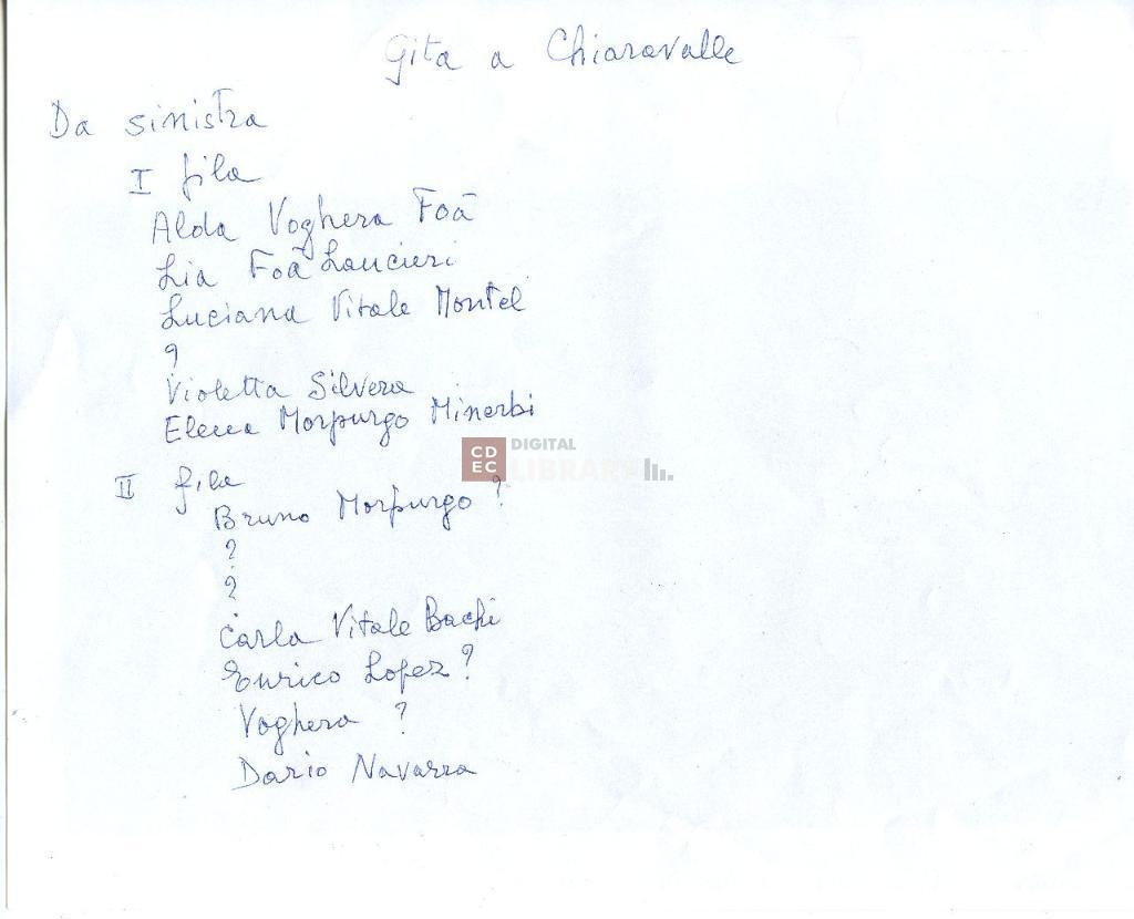 iscrizioni | sul verso del supporto l'elenco manoscritto delle persone ritratte nella fotografia "Gita a Chiaravalle/ Da sinistra/ I fila Alda Voghera Foà/ Lia Foà Lancieri/ Luciana Vitale Montel/ ?/ Violetta Silvera/ Elena Morpurgo Minerbi/ II fila/ Bruno Morpurgo ?/ ?/ ?/ Carla Vitale Bachi/ Enrico Lopez?/ Voghera?/ Dario Navarra" |