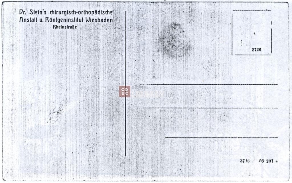 | notizie storico-critiche | Il prof. Albert Eugen Stein, medico chirurgo specializzato in ortopedia e operante presso l'istituto ortopedico di Wiesbaden, è autore di apparecchiature sanitarie ortopediche. La cartolina riporta la didascalia "Dr. Stein's chirurgisch-orthopädische Anstalt u. Röntgeninstitut Wiesbaden Rheinstraße" [trad. Istituto chirurgico-ortopedico del Dott. Stein - Istituto radiologico/ Wiesbaden/ Rheinstrasse"] |