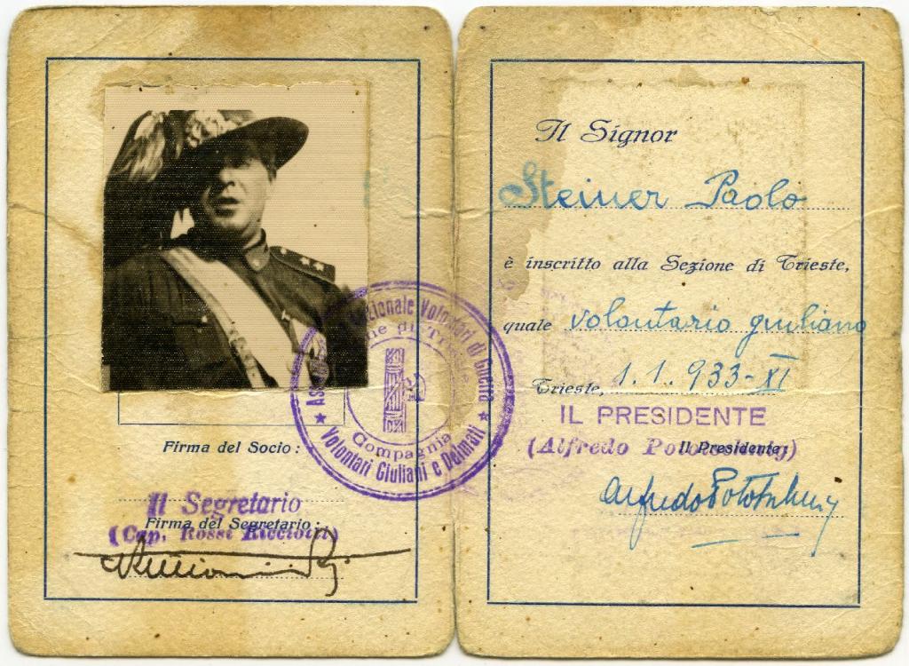 | notizie storico-critiche | Il 1° gennaio 1933 viene emessa dalla Sezione di Trieste della Compagnia Volontari Giuliani e Dalmati della Associazione Nazionale Volontari di Guerra la tessera che qualifica Paolo Steiner come Volontario Giuliano |