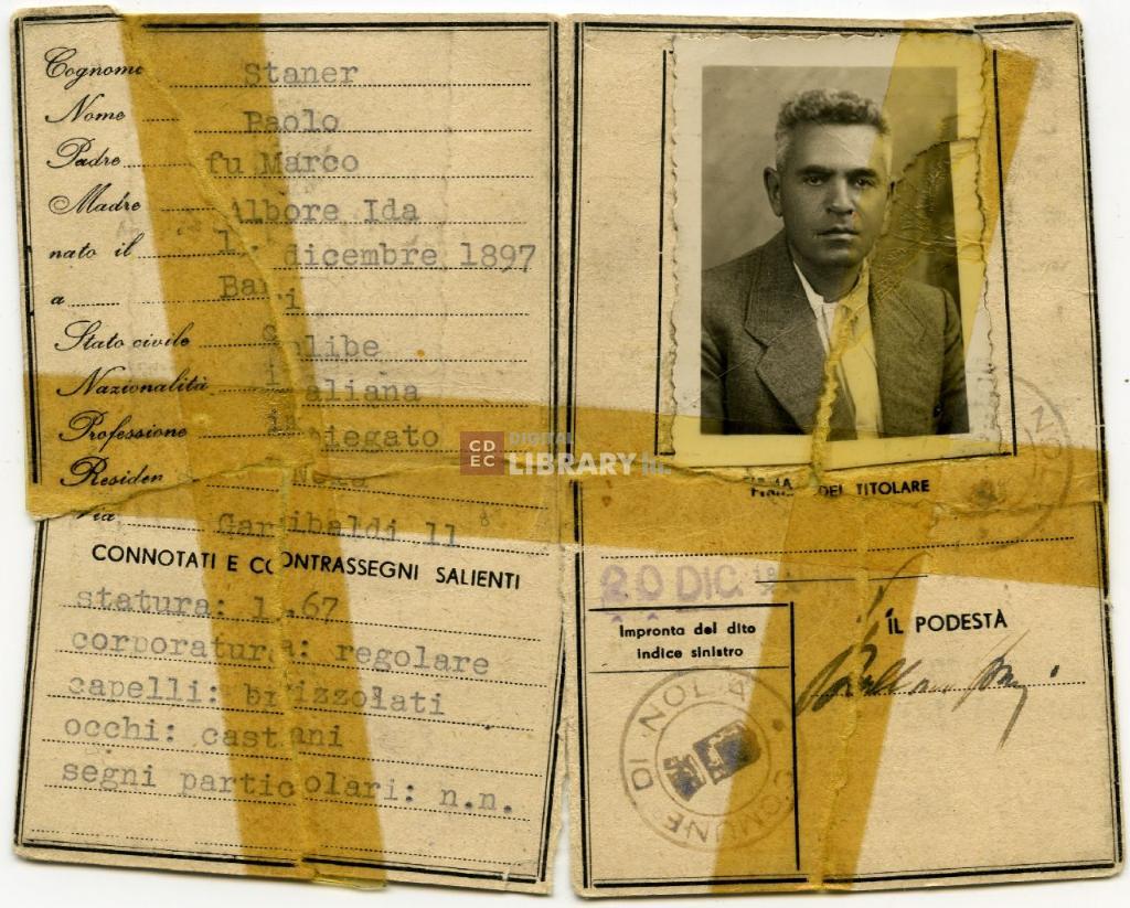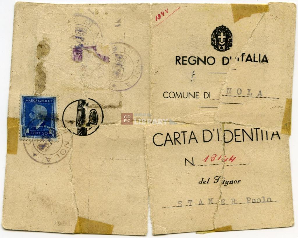 | notizie storico-critiche | La carta d'identità con false generalità reca il timbro di emissione del Comune di Nola (Bari) e la data 20 dicembre 1941. Il documento era stato stracciato e poi ricomposto incollando le parti con nastro di scotch. |