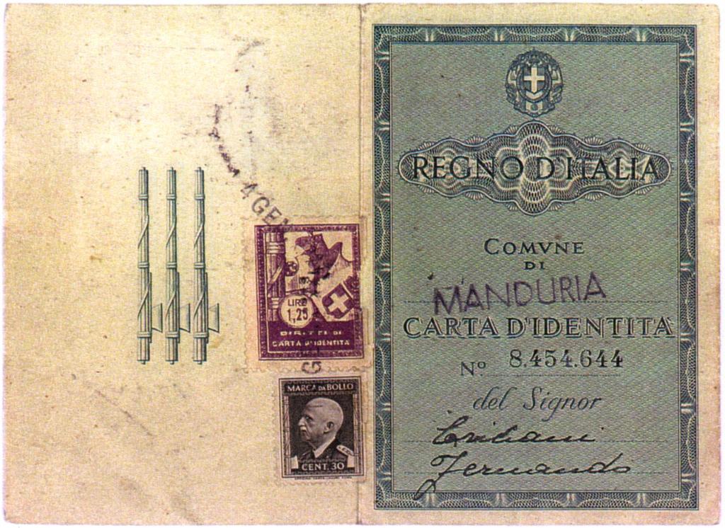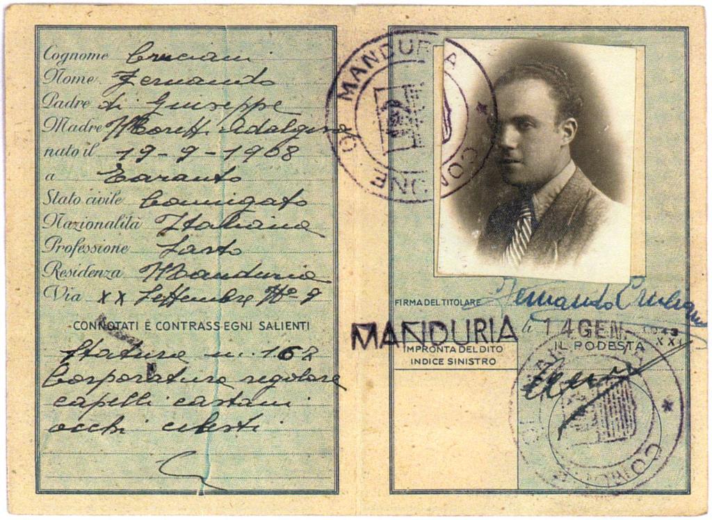 | notizie storico-critiche | La carta d'identità con le false generalità di Fernando Fiano risulta emessa il 14 gennaio 1943 dal Comune di Manduria (Taranto) |