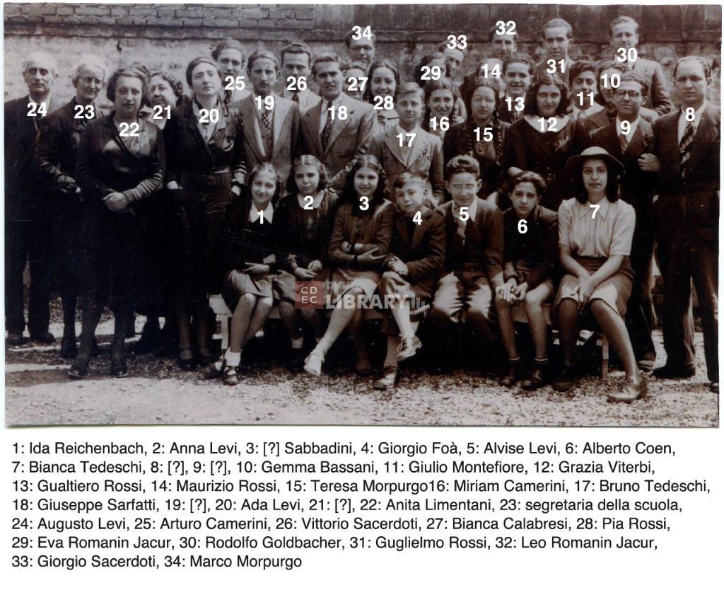 | osservazioni | Nella fotografia sono presenti, come riportato nel foglio allegato, 1: Ida Reichenbach, 2: Anna Levi, 3: [?] Sabbadini, 4: Giorgio Foà, 5: Alvise Levi, 6: Alberto Coen, 7: Bianca Tedeschi, 8: [?], 9: prof. Giorgio Bassani, 10: prof.ssa Gemma Bassani, 11: Giulio (detto Lullo) Montefiore, 12: Graziella Viterbi, 13: Gualtiero Rossi, 14: Maurizio Rossi, 15: Teresa (detta Teresina) Morpurgo, 16: Myriam Camerini, 17: Bruno Tedeschi, 18: Giuseppe Sarfatti, 19: [?], 20: prof.ssa di francese Ada Levi, 21: [?], 22: prof.ssa Anita Limentani, 23: segretaria della scuola, 24: prof. Augusto Levi, preside della scuola, 25: Arturo Camerini, 26: Vittorio Sacerdoti, 27: Bianca Calabresi, 28: Pia Rossi, 29: Eva Romanin Jacur, 30: Rodolfo Goldbacher, 31: Guglielmo Rossi, 32: Leo Romanin Jacur, 33: Giorgio Sacerdoti, 34: Marco Morpurgo |