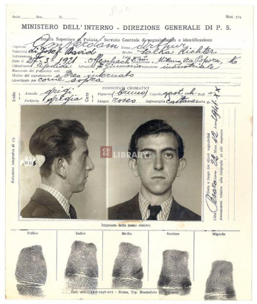 | osservazioni | Il documento, a cura del Servizio centrale di segnalamento e identificazione della Scuola superiore di Polizia, riporta i rilievi segnaletici di Arthur Amsterdarm e fu compilato dalla Divisione Polizia del Ministero dell'Interno, Direzione generale di Pubblica Sicurezza di Pesaro il 22 dicembre 1941; motivo della segnalazione alle Autorità il fatto di essere un "ebreo internato". Arthur Amsterdam morì nell'eccidio del campo di aviazione di Forli il 5 settembre 1944. |