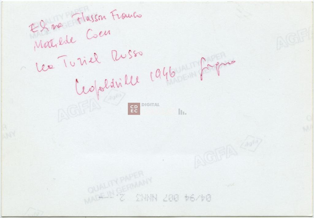 | iscrizioni | sul verso del supporto l'indicazione manoscritta a penna rossa "Elisa Hasson Franco/ Matilde Coen/ Lea Turiel Russo/ Leopoldville 1946 Giugno" |