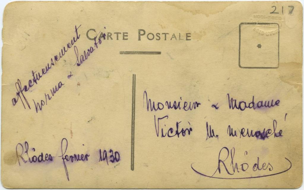 | iscrizioni | sul verso del supporto la dedica manoscritta "affectueusement Norma & Salvatore/ Rhodes fevrier 1930" e l'indirizzo "Monsieur & Madame Victor M. Menasché/ Rhodes" |
