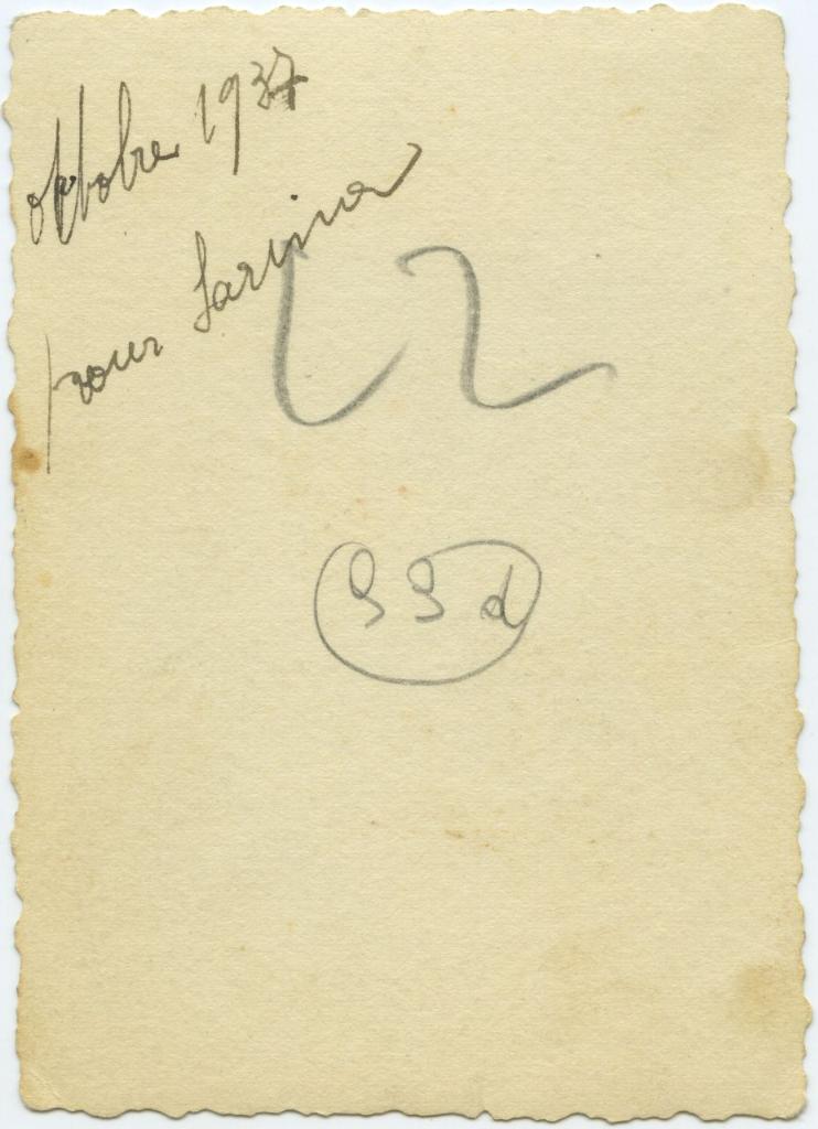 | iscrizioni | sul verso del supporto l'indicazione manoscritta "octobre 1937 pour Sarina" |