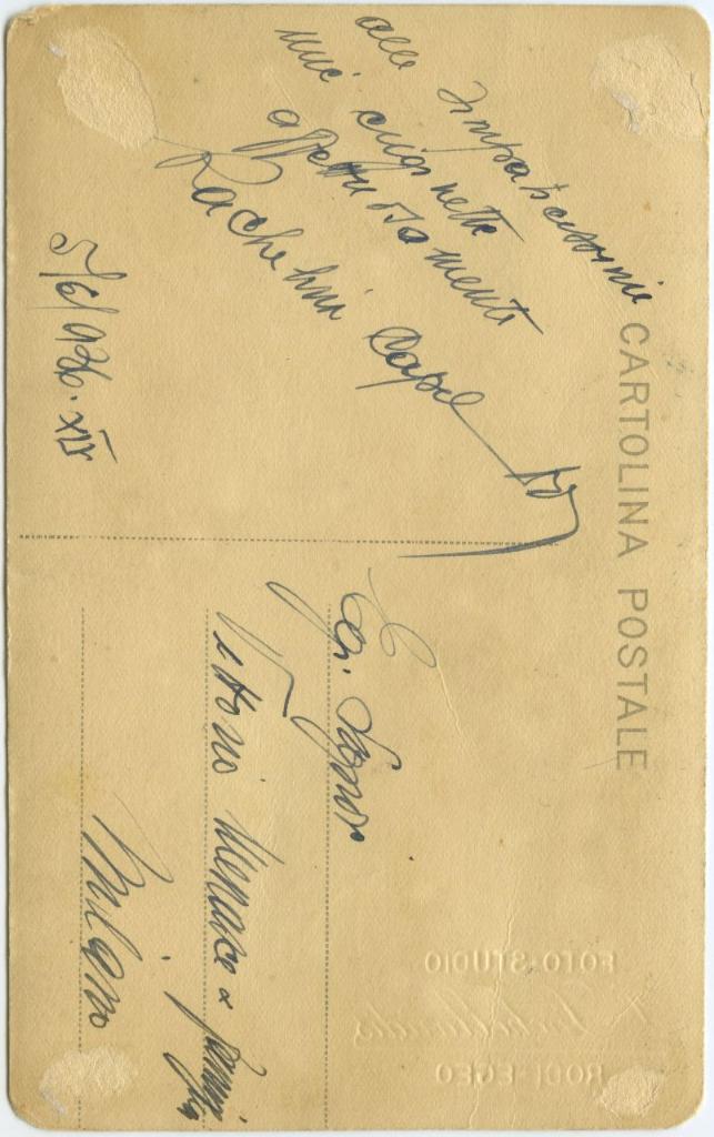 | iscrizioni | sul verso del supporto la dedica manoscritta "alle simpaticissime mie cuginette Rachelina Capelluto/ 5/6/936-XIV" e l'indirizzo del destinatario "Egr. Signor Vittorio Menasce & famiglia/ Milano" |