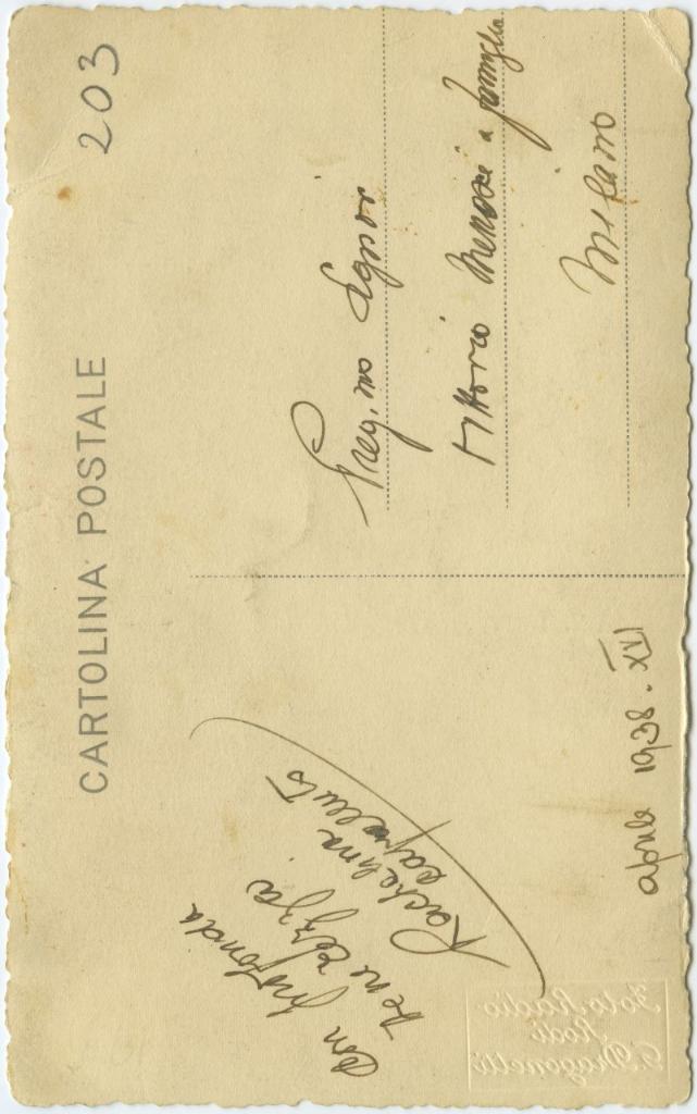 | iscrizioni | sul verso del supporto la dedica manoscritta "con profonda tenerezza Rachelina Capelluto/ aprile 1938-XVI" e l'indirizzo "Preg.mo Signor Vittorio Menascé & famiglia/ Milano" |