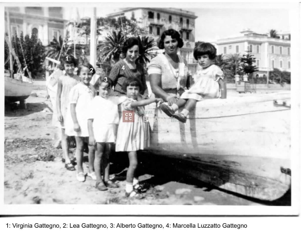 osservazioni | Nella fotografia si riconoscono 1: Virginia Gattegno (poi coniugata Cipolato), 2: Lea Gattegno, 3: Alberto Gattegno e 4: la madre Marcella Luzzatto in Gattegno |