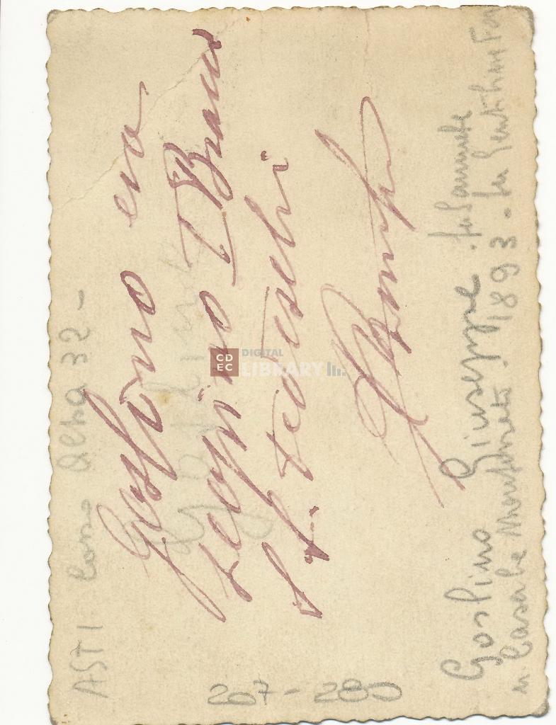 iscrizioni | sul verso del supporto: "Asti Corso Alba 32/ Goslino Giuseppe fu Samuele n. Casale Monferrato 1893. fu Gentilina Foa/ Goslino era [...] tedeschi [firma illeggibile]" |
